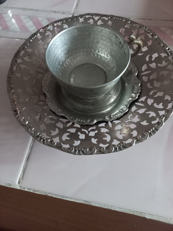 Gri renkte, desensiz metal klasik tasarımlı tabak. Fincanın üzerinde tokmaklı doku ve küçük bir kulp bulunur. ☕