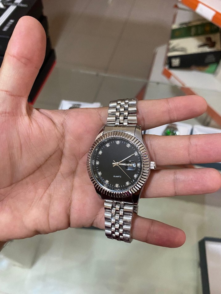 Gri kadranlı, pırlanta görünümlü saat işaretçilerine ve gümüş metal kayışa sahip klasik ve modern tarzda erkek kol saati. ⌚KUTUSU İLE BİRLİKTE GÖNDERİLECEKTİR