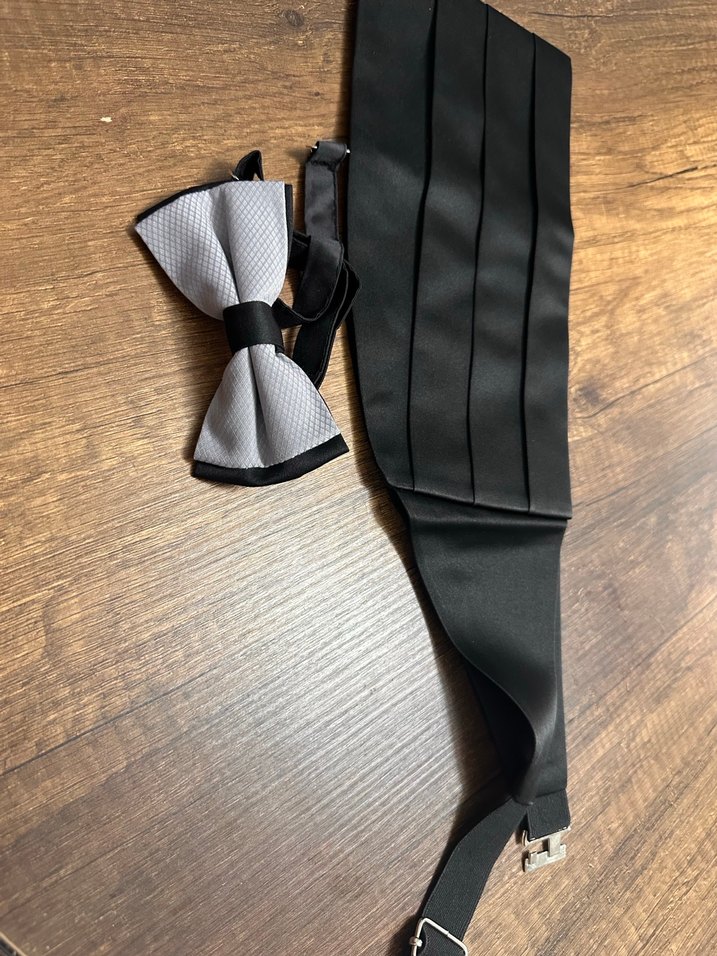 Siyah pileli kuşak ve siyah kenarlı gri papyondan oluşan klasik erkek aksesuar seti. Mat dokulu şık tasarım.