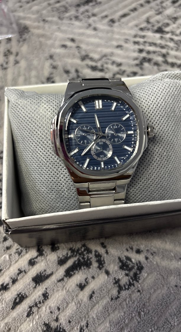 Gri metal kayışa ve üç alt kadranlı koyu mavi kadrana sahip klasik ve çağdaş erkek saati. ⌚ ürünlerimiz sıfırdır ve kutulu ile gönderim sağlamaktadır