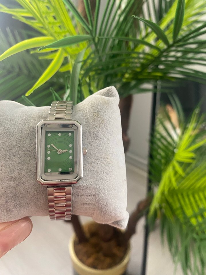 Kadınlar için yeşil dikdörtgen kadranlı, minimalist işaretli ve gri metal kemerli kayışlı saat. Modern ve klasik şıklığı bir arada sunar. ⌚çelik tir paslanma kararma yapmaz lastiklidir her bilege uyar