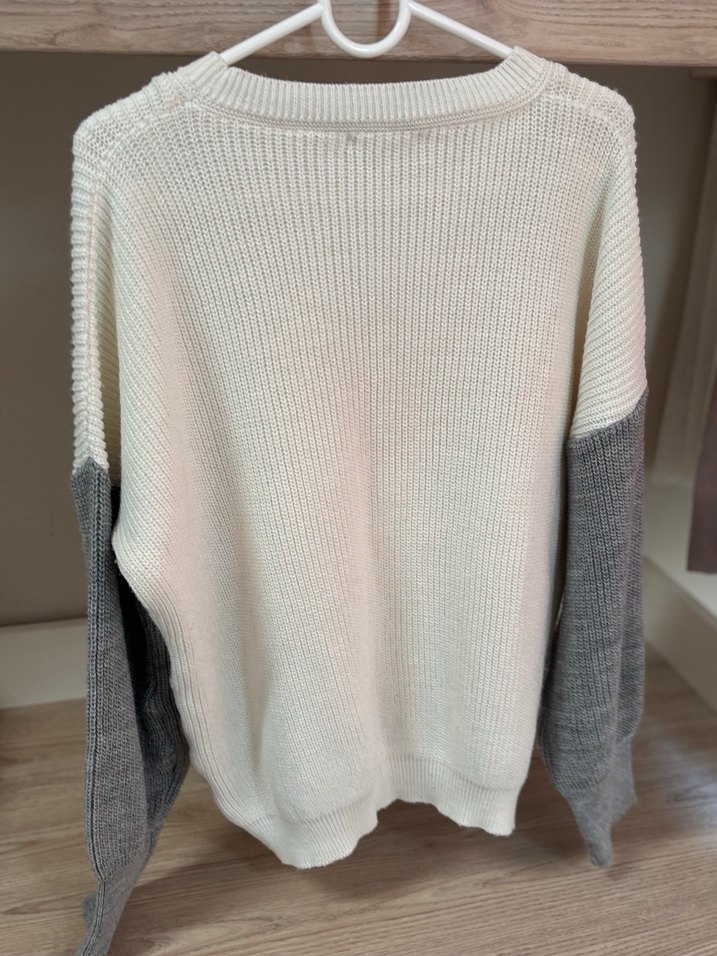 Yuvarlak yaka ve uzun kollu, bol kesim kadın kazak. Beyaz örgü ve gri kollu, günlük kullanıma uygun rahat sokak stili.