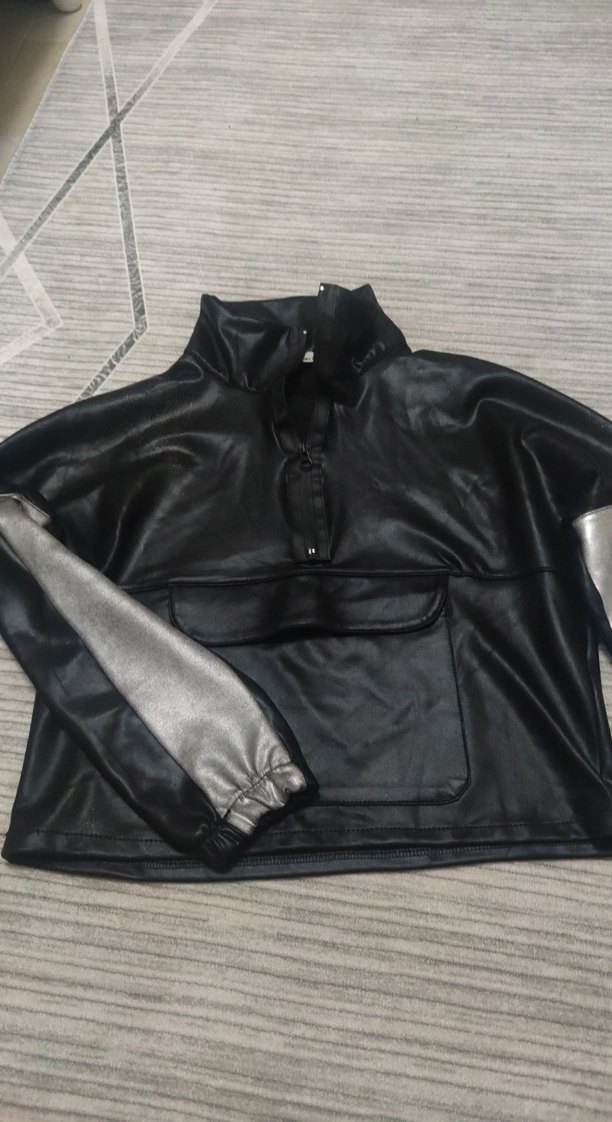 Yüksek yakalı, düğmeli siyah deri ceket, gri uzun kollu detaylarla. Salaş kesim ve kısa boy, günlük rahat stil için uygundur. fotoğraflar da belirttim kolunda grinin izleri çıkmış iki yerinde simli gibi duruyor başka bir kusuru yok