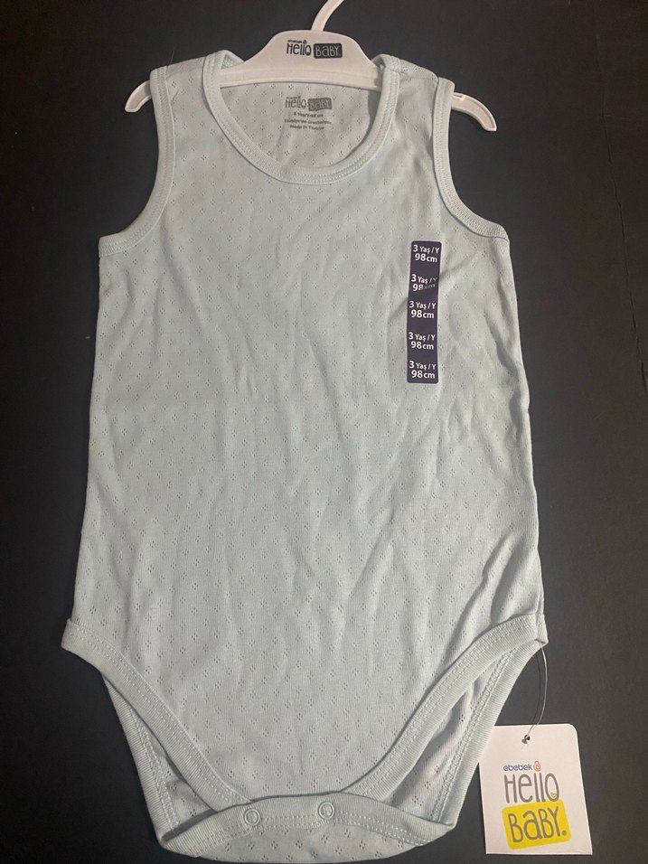 Kolsuz, yuvarlak yakalı gri bebek body. Yumuşak ve sıcak kumaştan üretilmiştir. 'BaBY, Hello' yazısı vardır, sokak stili için uygundur.