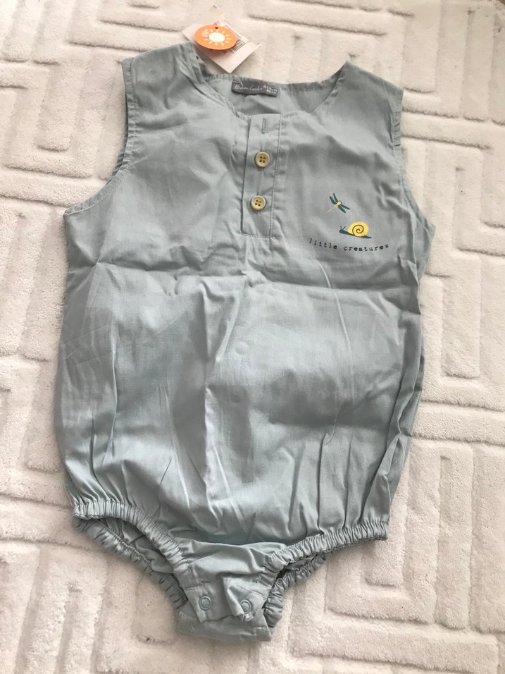 Gri keten kumaştan, kolsuz, yakalı ve düğmeli bebek tulumu. Nakış detaylı ve rahat oturan lastikli bacak kısmı bulunur. rengi mint yeşili fotoğrafta belli olmadı
