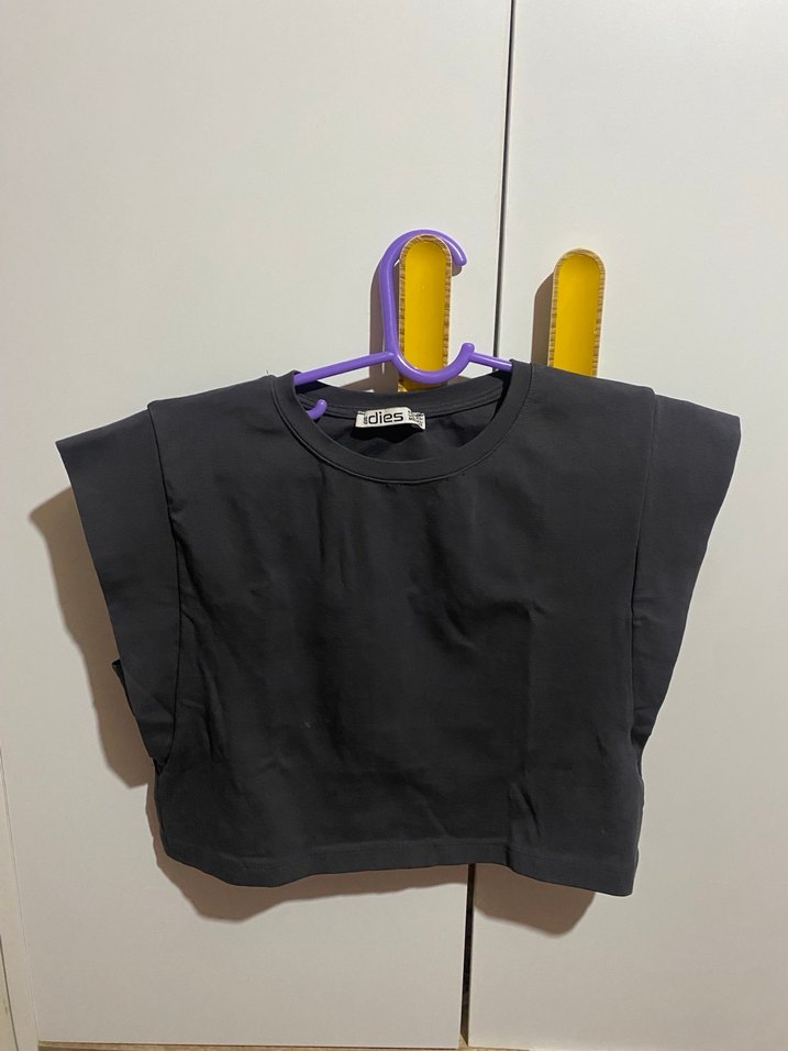 Gri kolsuz crop top, salaş kesim ve yuvarlak yakalı. Minimalist baskılı tasarımıyla günlük sokak stili için uygun.