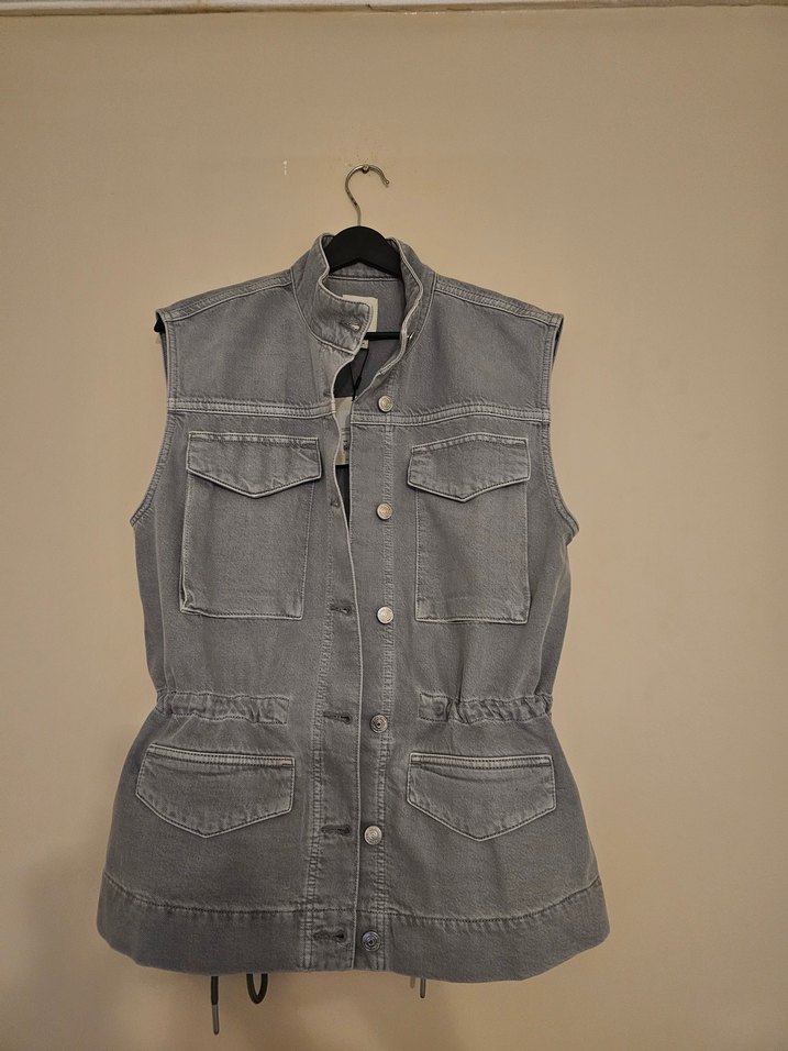 Gri renkte, kolsuz denim ceket. Yakalı, kemerli ve normal boyda, rahat kesim sunar. Günlük sokak stili için uygundur. ürün yurtdışı tasarımıdır