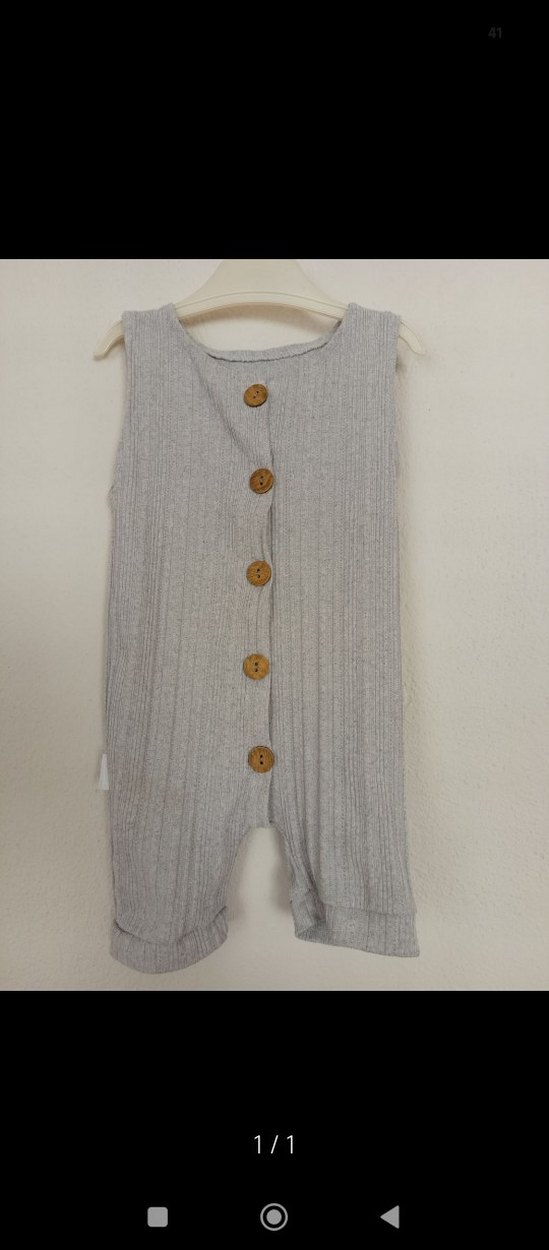 Gri keten kumaştan, kolsuz ve düğmeli bebek tulumu. Yuvarlak yakalı ve desensiz sade tasarıma sahiptir.