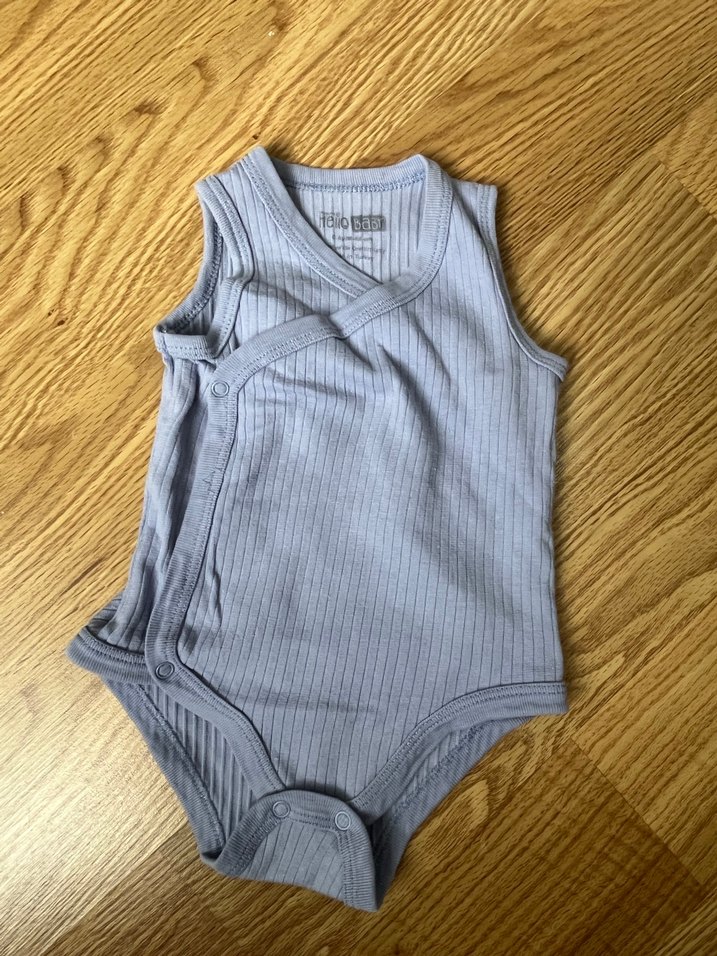Gri renkte, kolsuz erkek bebek body. V yaka ve çıtçıtlı kapama özelliği bulunur. Yumuşak keten kumaştan üretilmiştir.