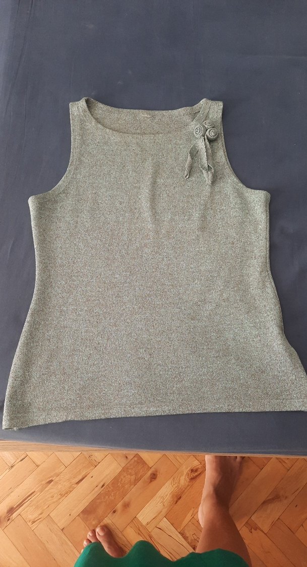 Gri renkte, kolsuz, yuvarlak yakalı kadın triko süveter. Örme keten kumaştan, bol kesim ve midi boyda. Omuzda küçük süs detayı bulunur. Günlük kullanıma uygun.