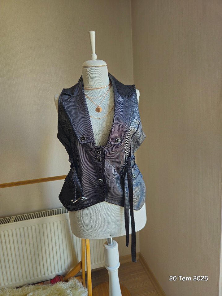 Gri yelek, kemerli ve kesimli yakalı, normal kesim. 3 beden yaziyor ben 42 bedenken kullandim.
