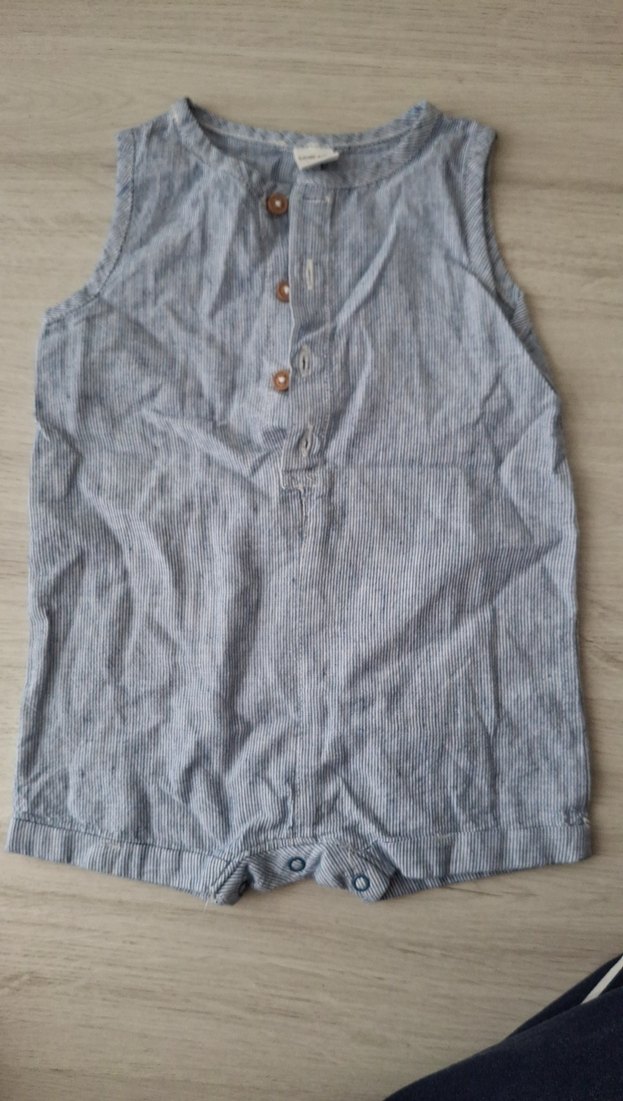Yumuşak keten kumaştan, kolsuz ve V yaka erkek bebek tulumu. Düğmeli ve desen içermeyen gri, bohem tarzda.