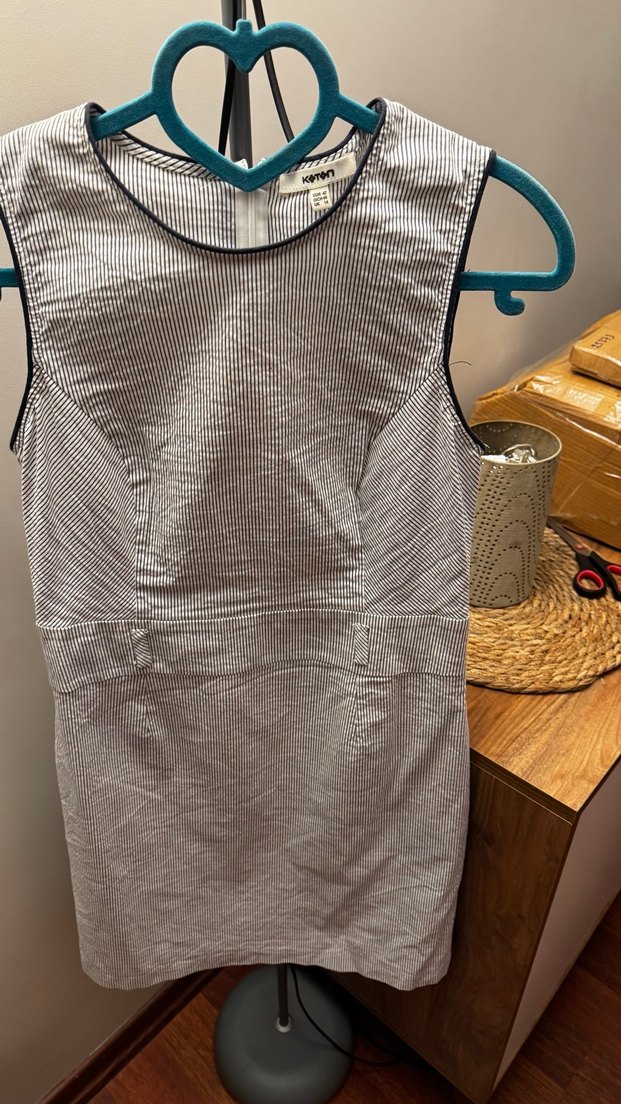 Kolsuz, , keten kumaştan yapılmış gri midi elbise. Sıkı kesim ve fermuarlı sırt detayı ile günlük sokak stili için uygun. Sadece 1 kere kullanıldı 40-42 bedenle uyumlu