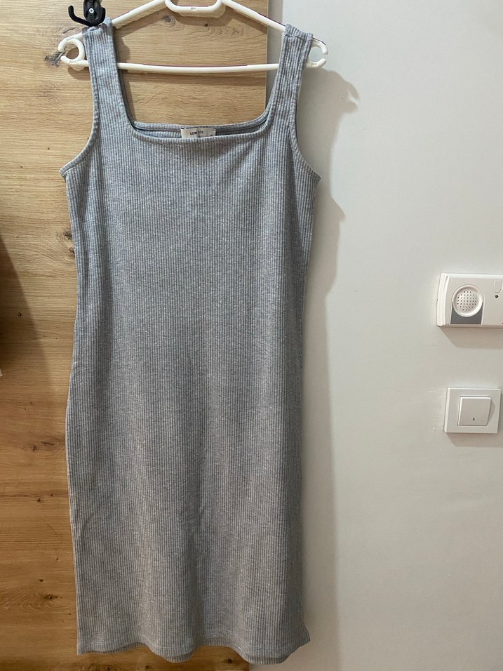 Düz kesim, kolsuz ve midi boy keten kumaştan yapılmış gri elbise. Minimalist, desen içermeyen tasarımı günlük kullanım için uygundur.