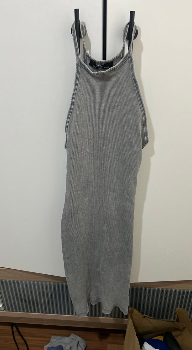 Nefes alabilen keten kumaştan yapılmış gri kolsuz midi elbise. Yüksek yakalı ve vücuda oturan kesimiyle günlük sokak stili için uygun.