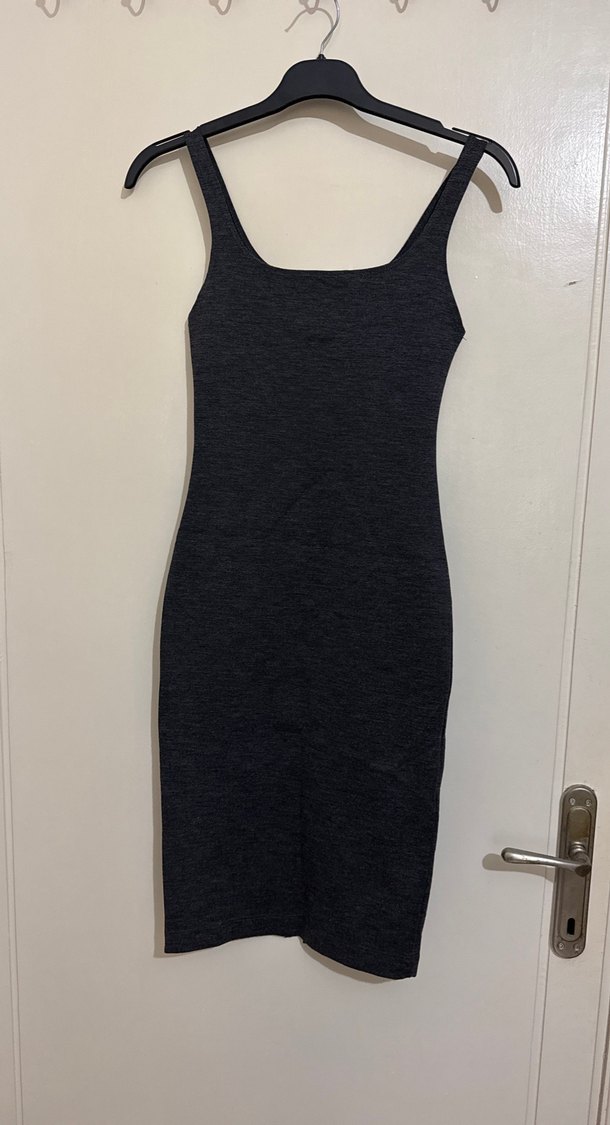 Gri renkte, kolsuz ve düz yakalı, midi boy oturan triko elbise. (Elbise normalde S beden ama daraltıldı, xs beden için uygun)