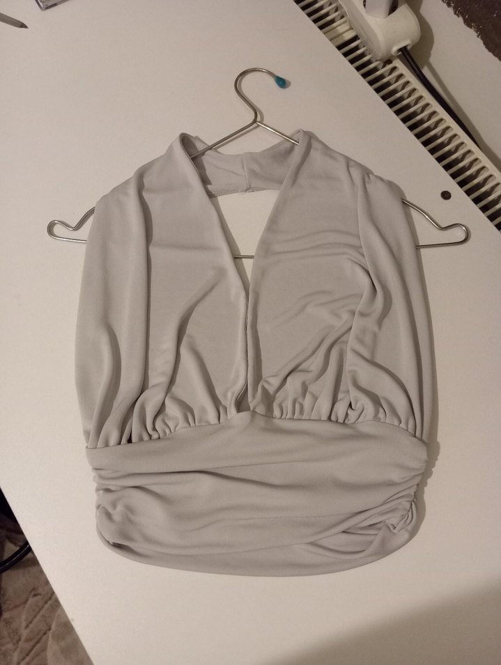 Kolsuz, gri kumaştan, drapeli ve sıkı kesimli V yaka kısa bluz. Minimalist tarzda, açık hava sokak giyimine uygun. Sırtında ve göğsünde dekolte bulunan şık bluz.