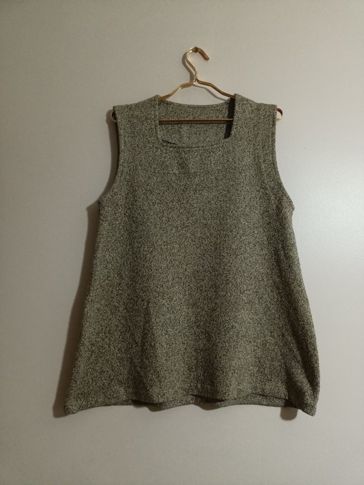 Gri renkli, kolsuz ve triko örme kadın süveter. Klasik yuvarlak yaka ve rahat, midi boy kesimiyle günlük kullanıma uygun. iki kol arası 50 cm uzunluk 70 cm