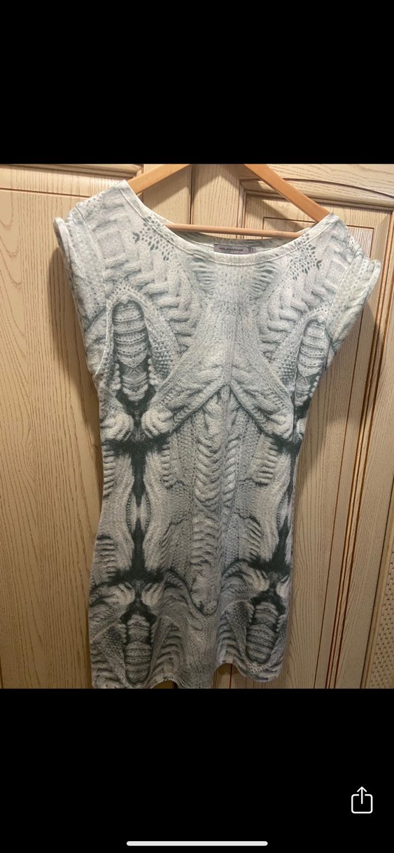 Kolsuz, gri triko elbise, fitted kesim, bisiklet yaka ve özgün batik desenli. Günlük kullanıma uygun bohem tarzda.