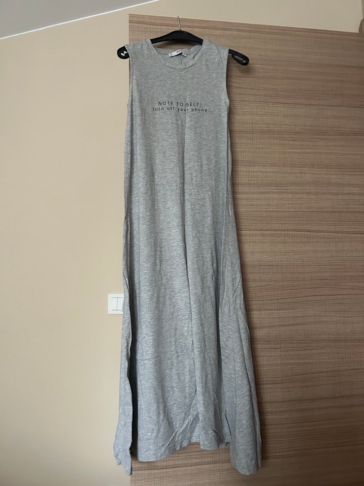 Gri kolsuz uzun elbise, keten kumaştan, bol kesim ve drapeli tasarımla günlük rahat kullanım için uygundur.