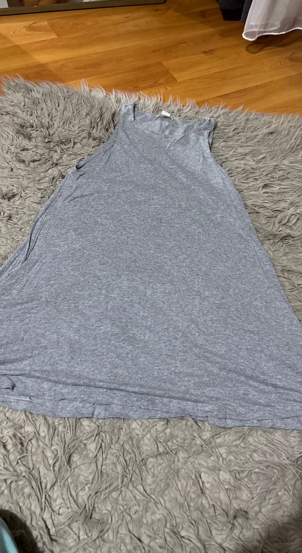 Gri kolsuz elbise, yüksek yakalı ve bol kesimdir. Yumuşak keten kumaştan yapılmış, drapeli tasarıma sahiptir. Günlük kullanıma uygundur.