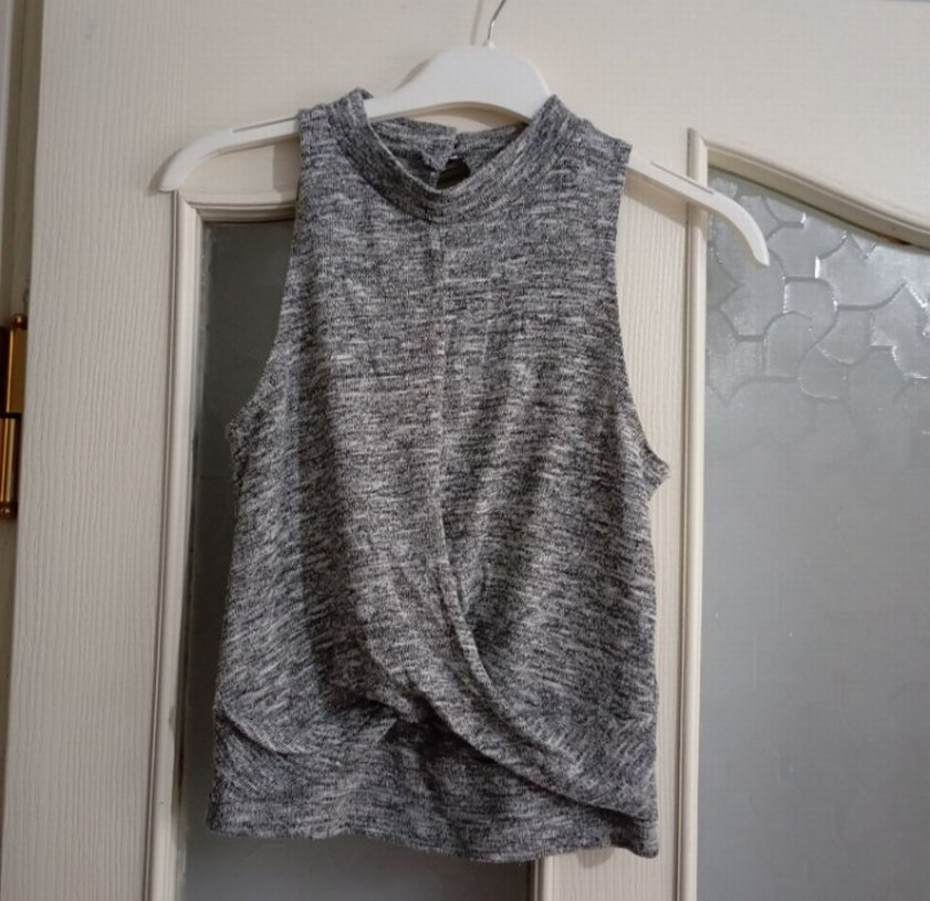Gri renkte, kolsuz ve yüksek yakalı kadın atlet. Keten kumaştan, normal midi uzunlukta ve drapeli, rahat sokak stili için uygundur.