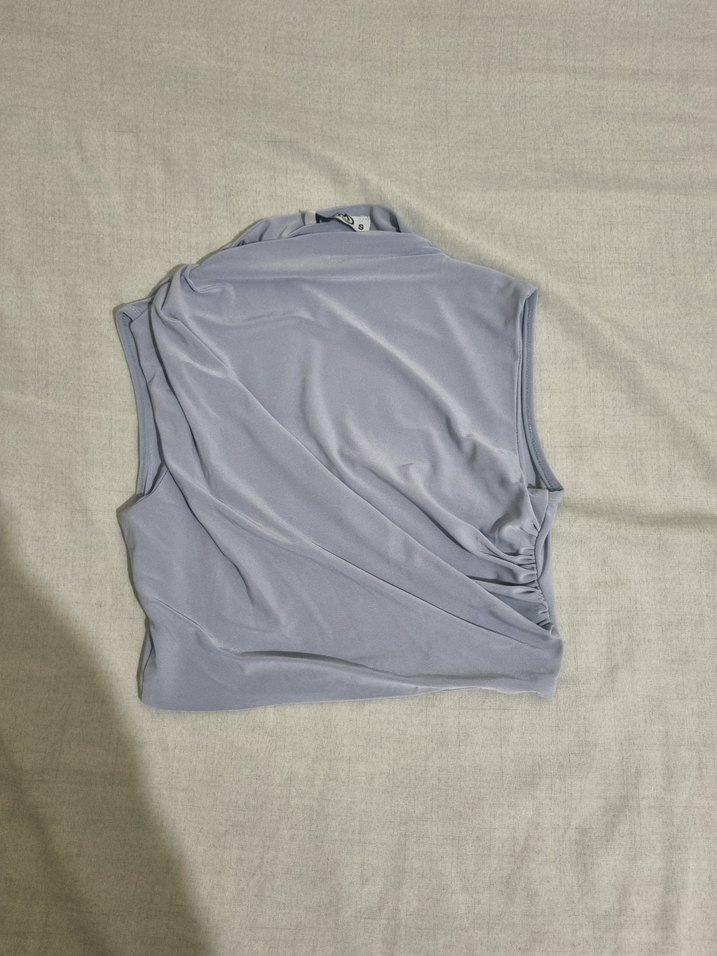 Kolsuz, yüksek yakalı ve drapeli gri kadın bluz, yumuşak keten kumaştan, vücuda oturan kesimde, sokak modası ve dış mekan kullanımı için uygundur.