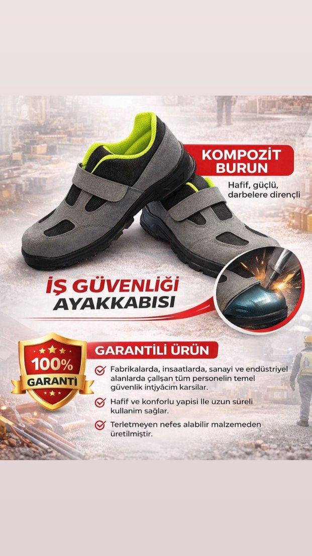 Gri iş güvenliği ayakkabısı, kompozit burunlu ve terletmeyen nefes alabilir malzemeden üretilmiştir. Hafif ve konforlu yapısıyla uzun süreli kullanım sağlar. Cırt cırtlı bantlarıyla kolay ayarlanır.