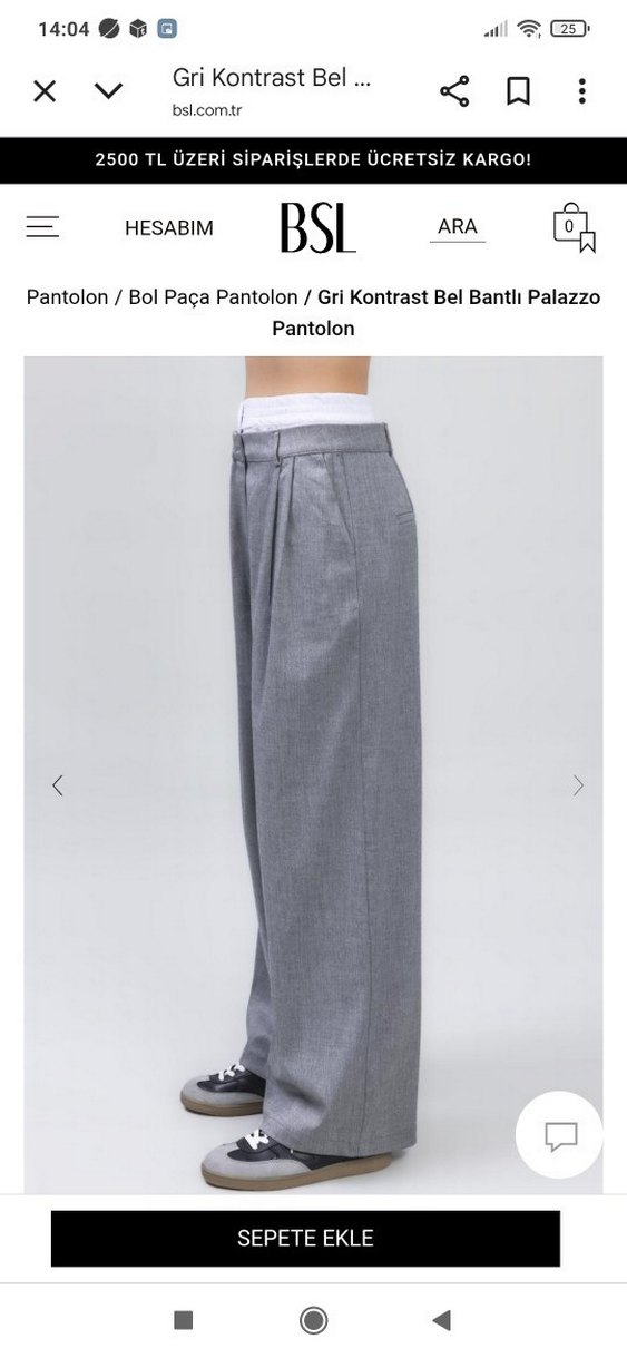Gri keten kumaştan, kontrast bel bantlı, pileli bol paça midi pantolon. Rahat ve günlük kullanım için uygundur.