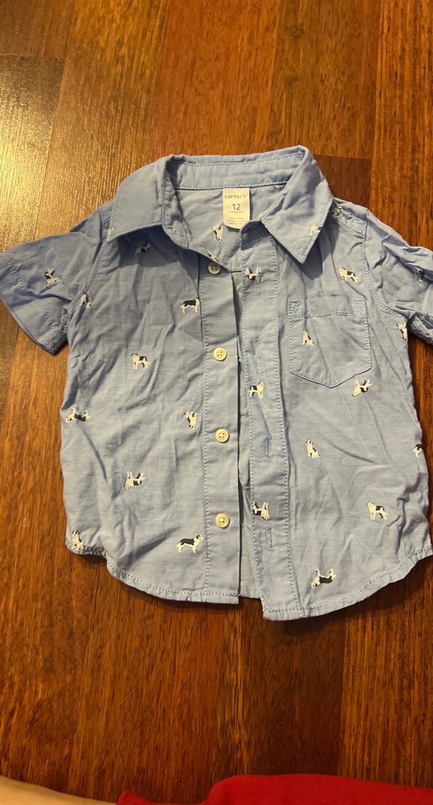 Gri renkte, nakışlı köpek desenleriyle süslenmiş, kısa kollu çocuk gömleği. Düğmeli ve yakalı, rahat kesimdir.