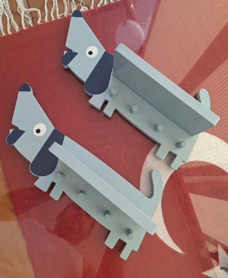 Gri renkte, köpek figürlü çocuk rafları, çoklu askı kancalarıyla eşyalarınızı düzenlemenizi sağlar. ürün tek fiyatıdır ikisi 1000 TL