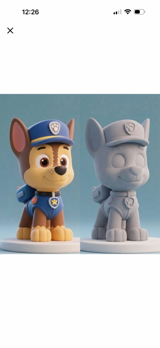 Figür, canlı mavi ve kahverengi kıyafetli bir köpek karakteri ile gri boyasız versiyonunu içerir. İkisi de yuvarlak taban üzerinde oturur ve detaylı yüz ile üniforma özellikleri vardır.