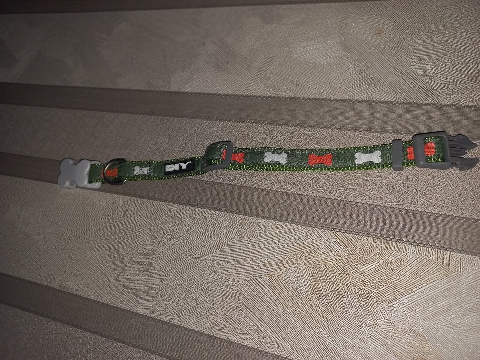 Kırmızı ve beyaz kemik desenli yeşil kayışa sahip gri Köpek tasması. Ayarlanabilir ve rahat.