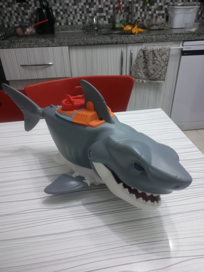 Gri renkte, detaylı tasarımlı köpekbalığı şeklinde su oyuncağıdır. Üstünde küçük turuncu parça bulunur. cilgin kopek baligi sadece ufak oyuncakari yok kusursuz surdukce kafa sag sol agzi acar kuyruk hareketli dir