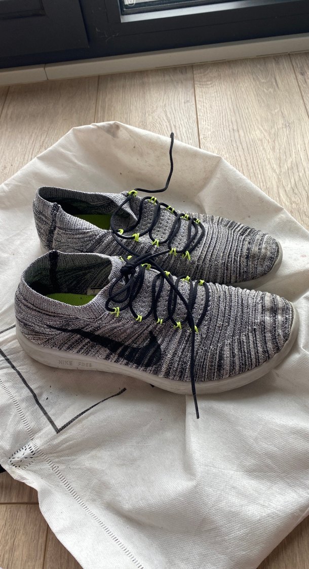 Gri örgü üst yüzeye ve kauçuk tabana sahip kadın spor ayakkabısı.
