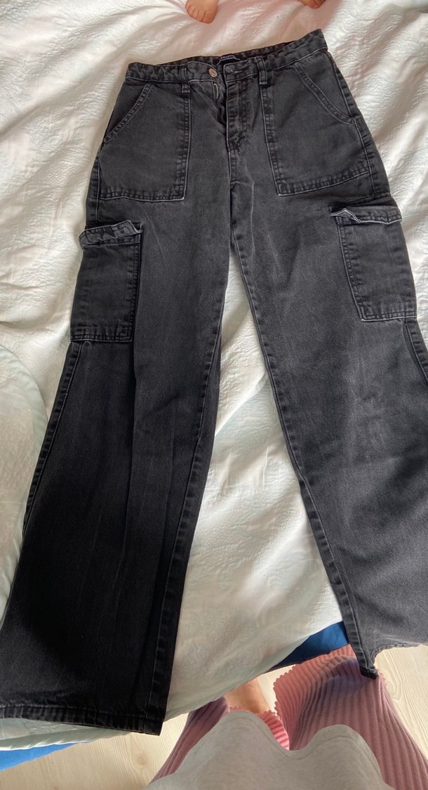 Gri kot kumaştan, bol kesim ve midi boyda, belinde tokalı detaylar bulunan, günlük kullanıma uygun street wear tarzı pantolon. Büyük cepleri vardır.