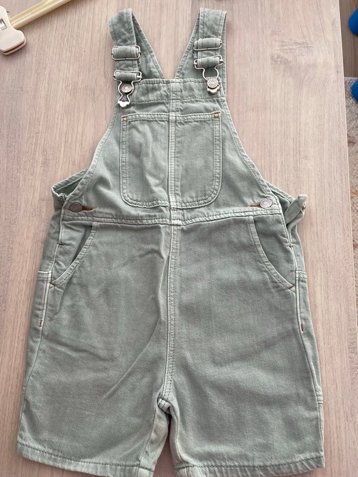 Gri kot kumaştan, bol kesim, askılı ve cepli erkek çocuk şortu. Tokalı askıları ve sokak stili ile uyumlu.