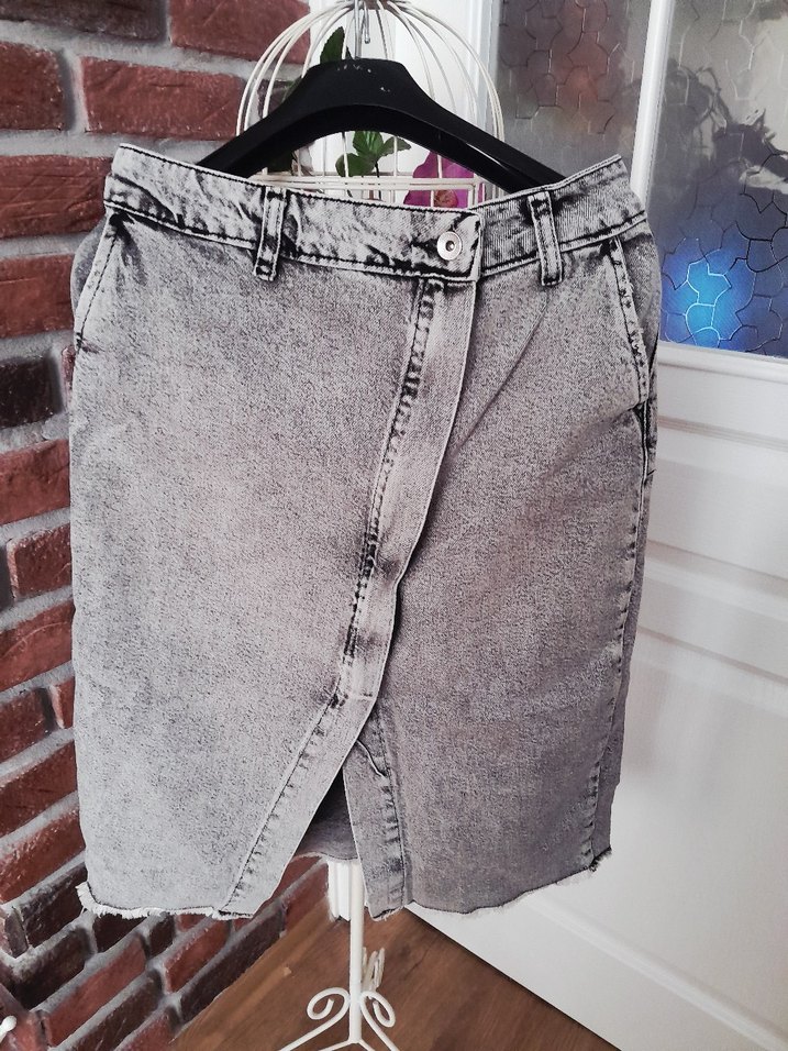 Gri kot kumaştan, vücudu saran asimetrik kesim ve kemerli bel detaylı, sokak stili . Günlük kullanıma uygun,diz altı boyda kot etek