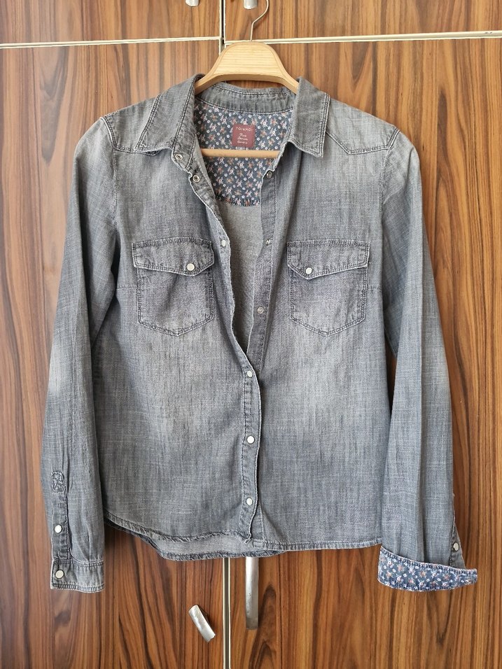 Gri kot kumaştan, bol kesim ve uzun kollu kadın gömlek. Düğmeli ve çift cep detaylı, günlük kullanıma uygun rahat model.