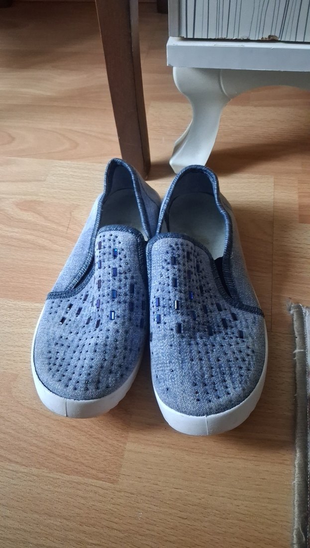 Kot kumaştan, gri mavi tonlarda, cırt cırtlı ve blok topuklu kadın günlük ayakkabısı, sokak stili ve athleisure için uygun biraz kullanıldı küçük taşlardan bazıları dökülmüş