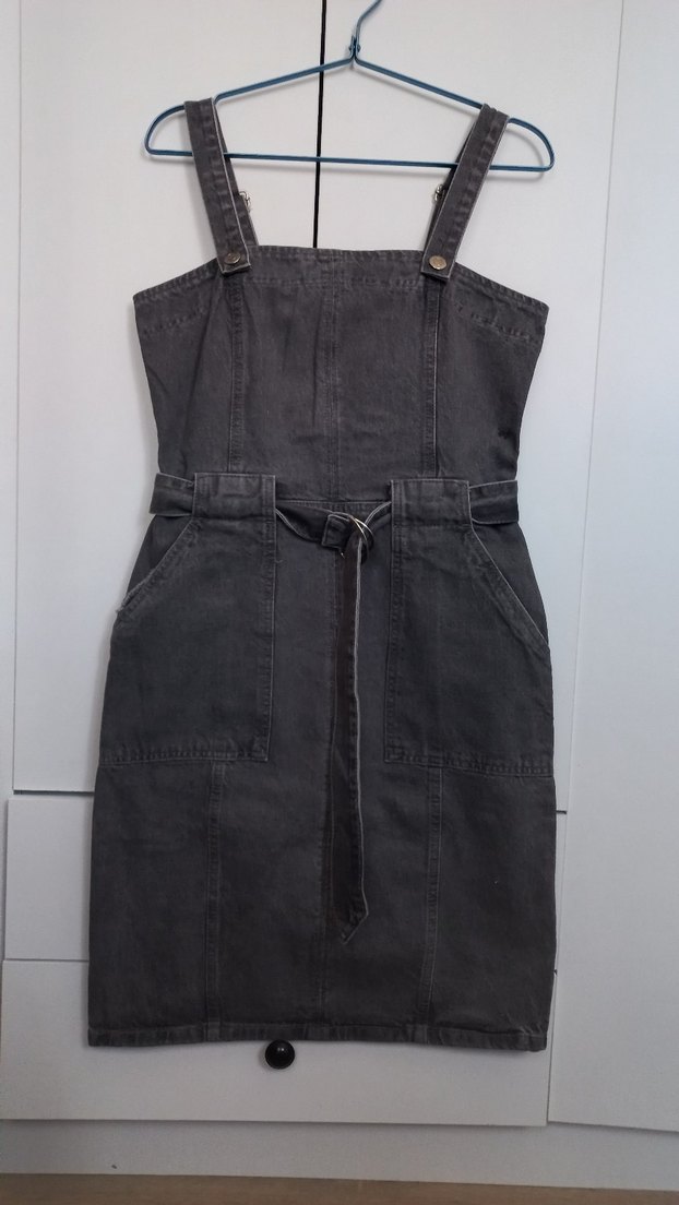 Gri kot kumaştan, kemerli ve askılı, straplez yaka tasarımlı, günlük kullanıma uygun sokak stili midi elbise Çok severek aldım. Sonra bazı kilo alışları giymeme engel oldu . Etiket mevcut değil fakat hiç giyilmedi . Ciddi alıcılara indirim mevcut :)