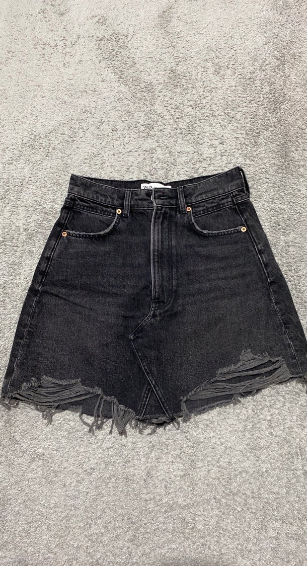 Gri kot mini etek, bol kesim ve kürklü detaylara sahip, yırtık uçlu, rahat ve şık sokak stiline uygun.
