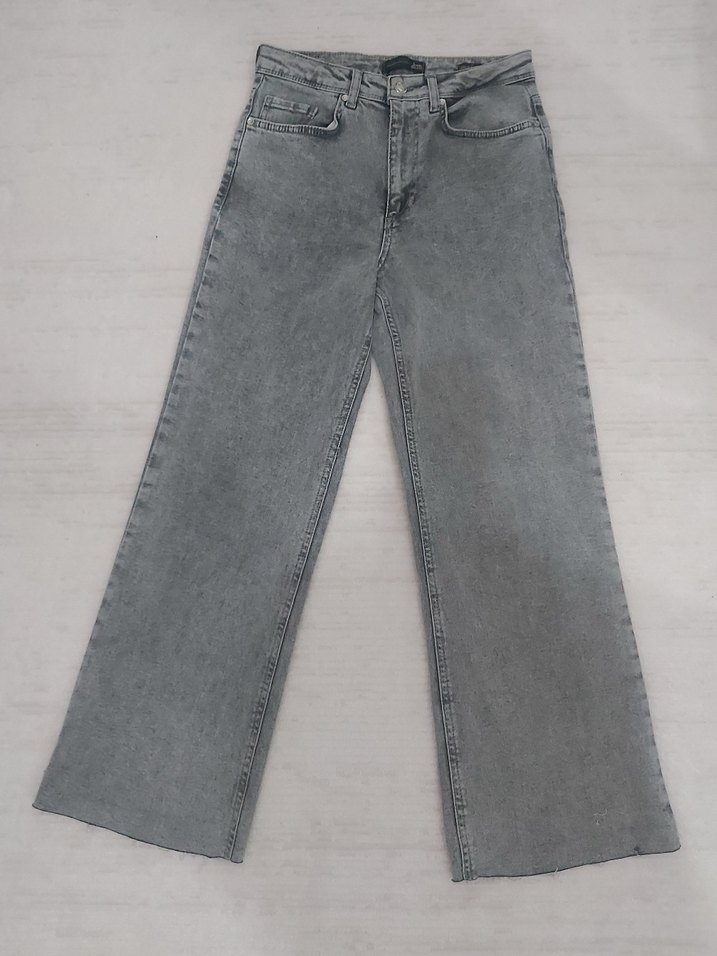 Gri renkte, regular fit ve midi boyda kot pantolon. Desensiz, günlük kullanıma uygun rahat bir model. Lc waikikiden almıştım, hiç giyilmedi diyebilirim sadece bir paçqsında ufak bi defosu var son resimde belirttim.Dar geldiği için giyemedim. Hafif İspanyol paça formunda 95 cm uzunluğunda.