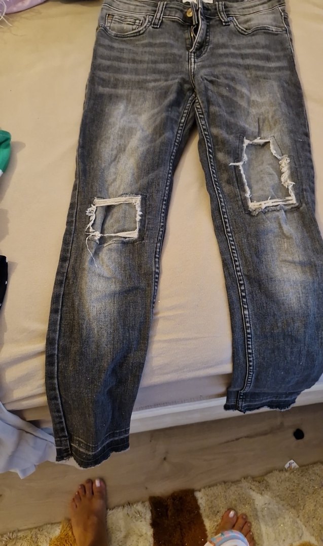 Gri kot kumaşından, yırtık detaylı midi uzunlukta pantolon. Günlük ve sokak stili için uygun.
