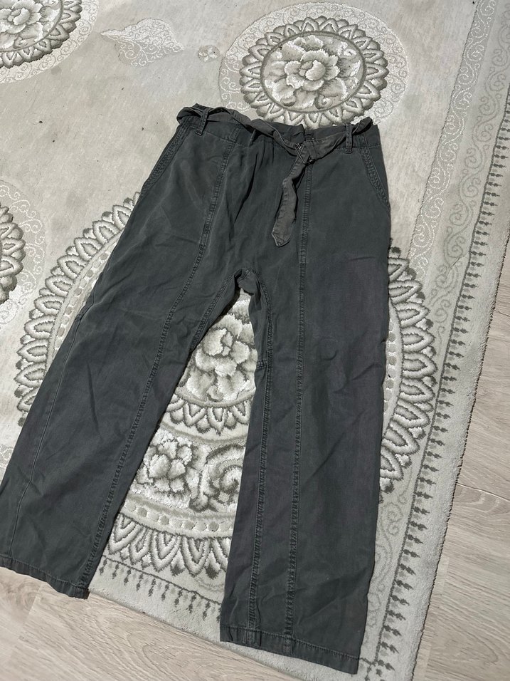 Gri kot kumaştan, salaş kesim ve kemerli midi boy kadın pantolon, günlük kullanıma uygun rahat sokak stili. Bacak boyu 65 cm belden paça boyu 99 cm