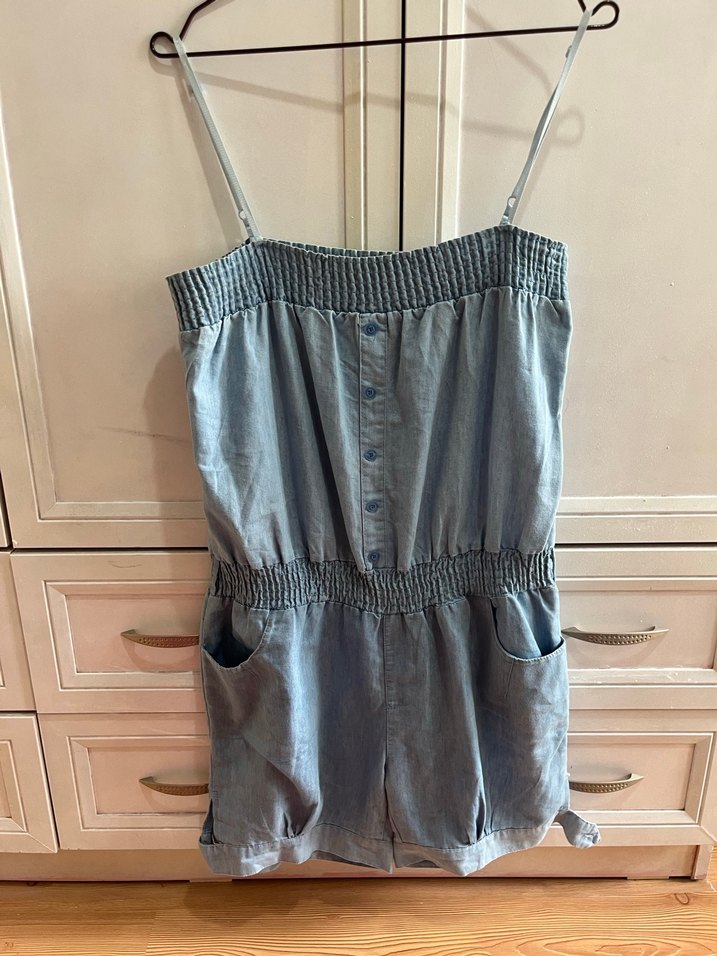 Gri kot tulum, straplez ve ince askılı, düğmeli ön kısmı ile dikkat çeker. Rahat oturuşlu, lastikli bel ve ceplidir, günlük sokak tarzı için uygundur.