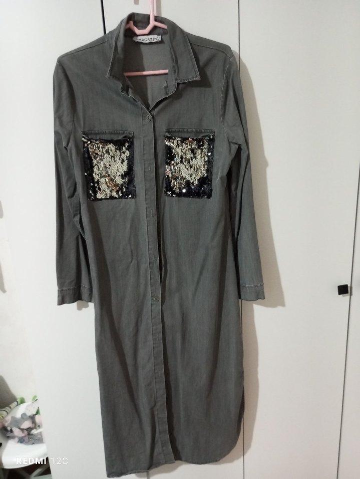 Gri renkte, uzun kollu ve düğmeli ön kısmı olan uzun tunik. cepleriyle günlük sokak stiline uygun.