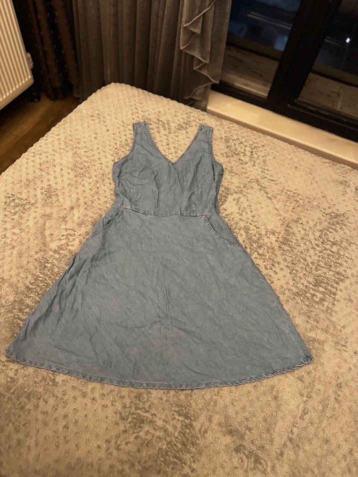 Kolsuz gri kot midi elbise, V yaka ve bol kesim ile bohem, rahat bir stil sunar. Fırfır detayları bulunur.