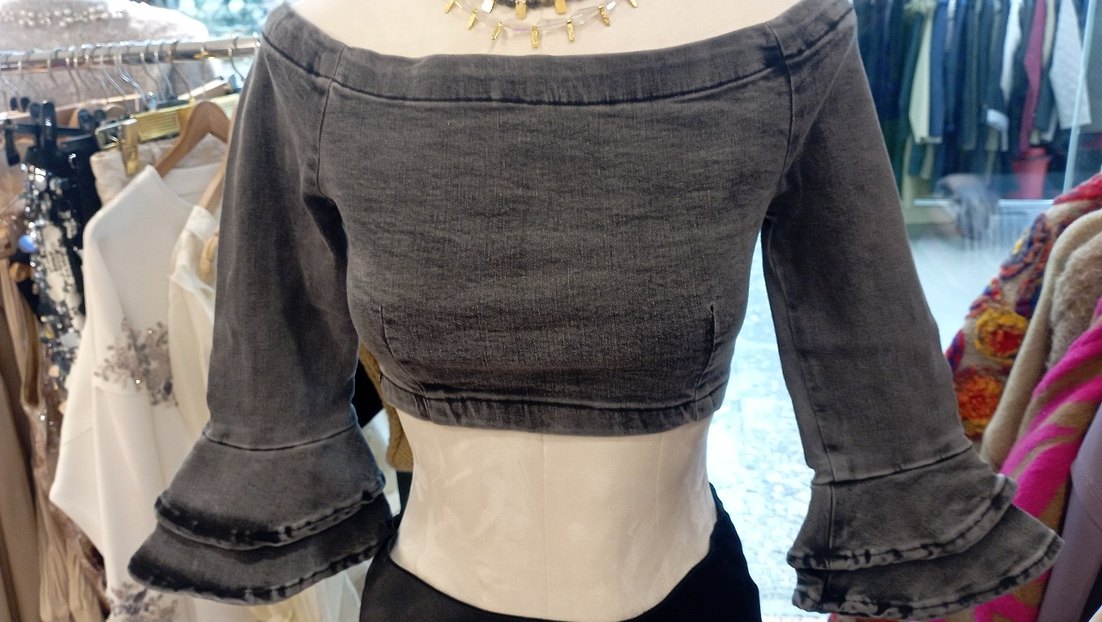 Gri renkte ve uzun ispanıyol kollu, tek renk kot kumașı dan yapılmış, tekne yaka ve midi boyda fitted bluzu.