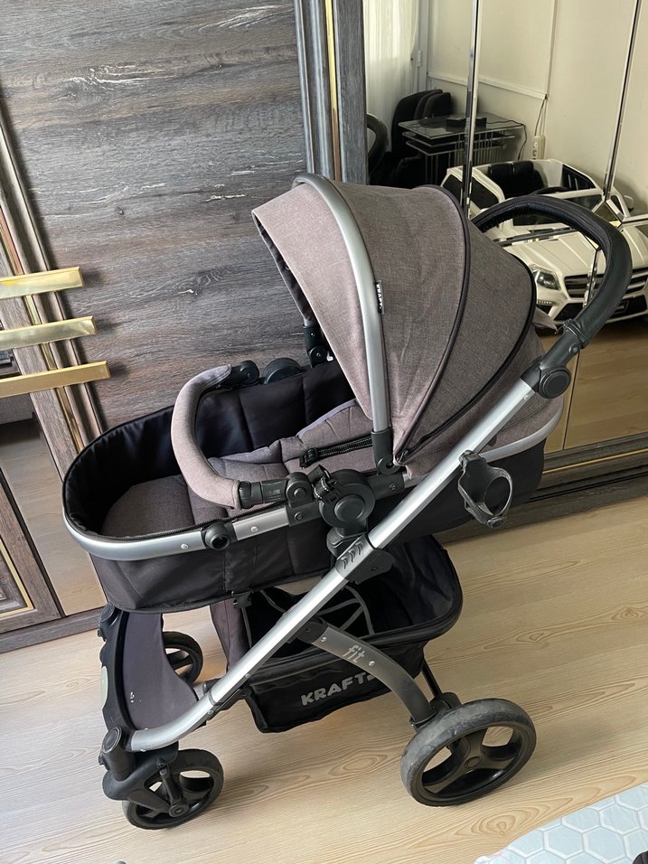 Ayarlanabilir tente ve yumuşak oturma alanına sahip gri Kraft bebek arabası. Dayanıklı iskelet ve alt kısımda saklama sepeti bulunur.